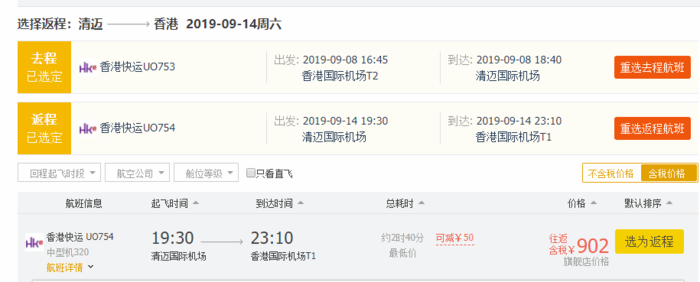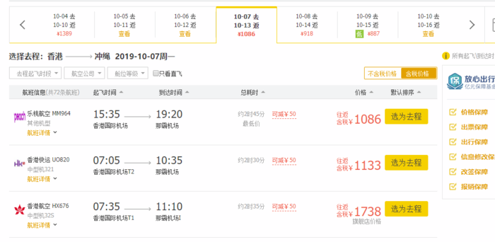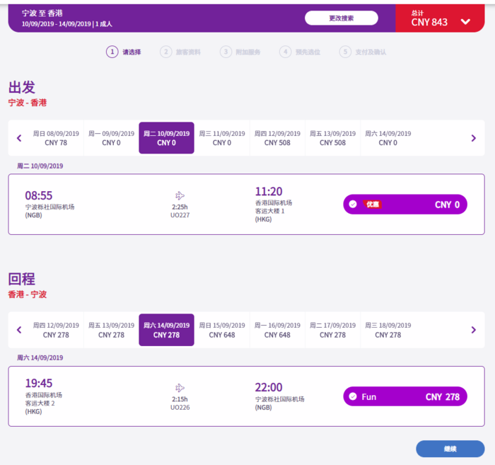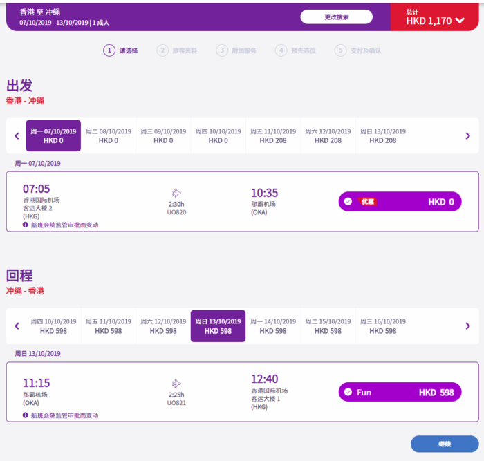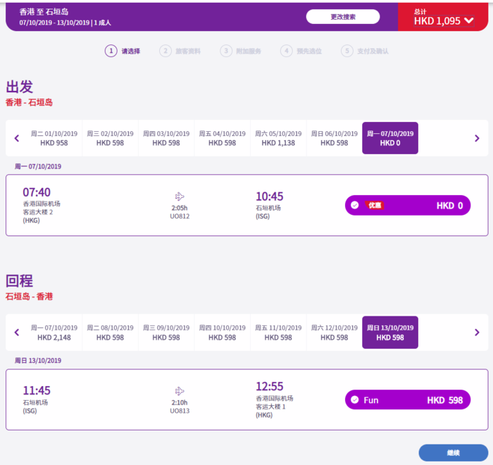 - 选择去回程航班,寻找刻有HKD0* 的去程机票。