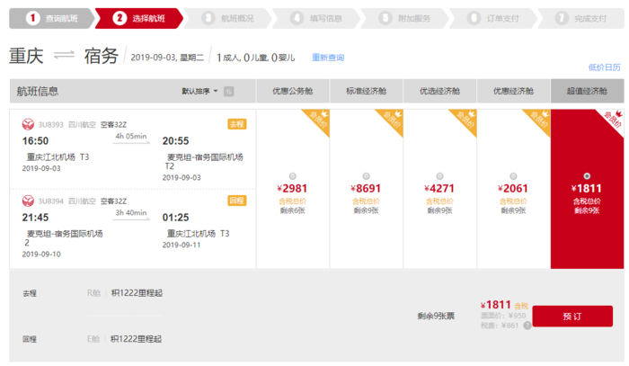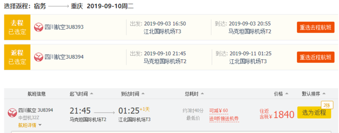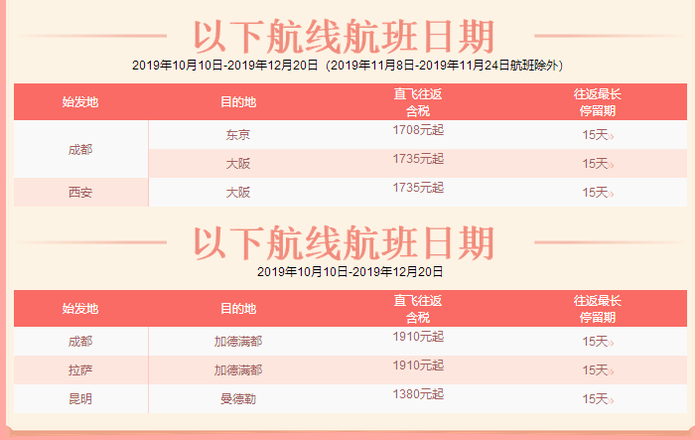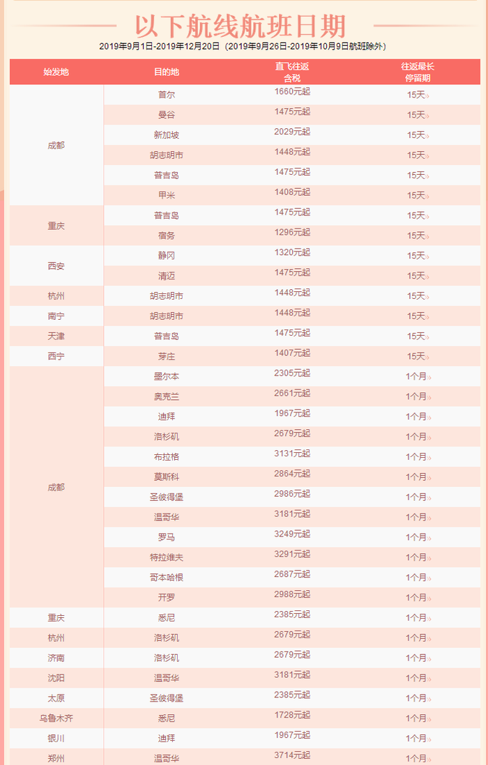 - 航班日期:2019年9月1日-2019年12月20日(2019年9月26日-2019年10月9日航班除外)