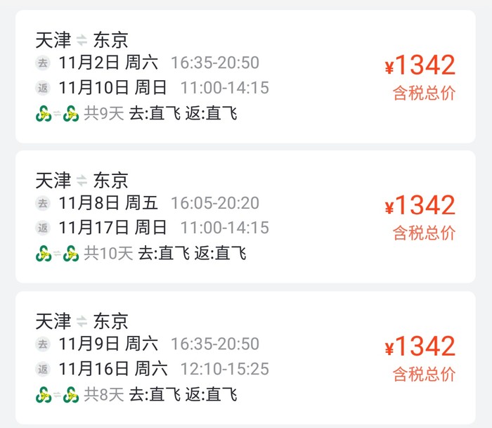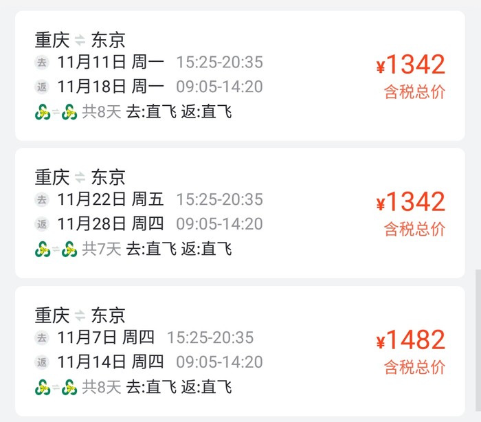 重庆往返东京,含税1300多元,11月多个时段有票。不过实测时,点进详情页面,价格变化很快,可以看看后续是否还会放票。