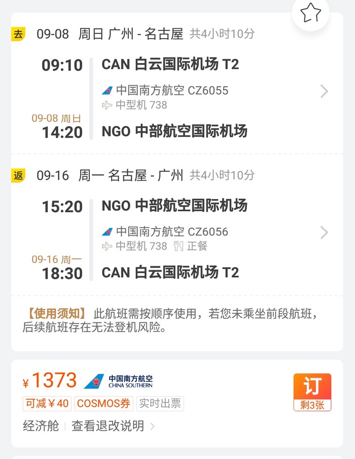 广州往返名古屋,南航执飞,含税券后才1333元,性价比超高!含行李,回程含餐,航班时间也很好!