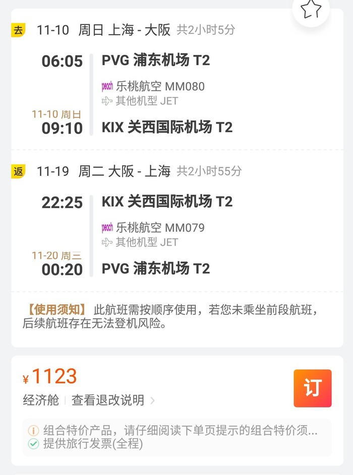 上海往返大阪,乐桃航空执飞,红叶季只要1123元,不过不含行李。