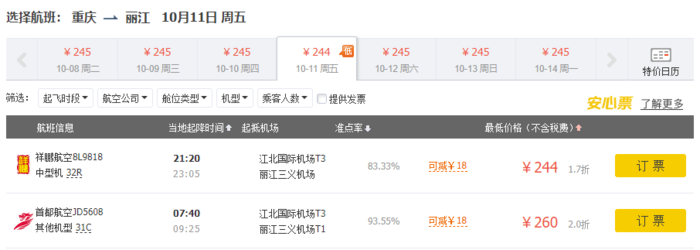 昨天搜,相同时段,重庆飞丽江244元,今天买更便宜!