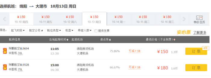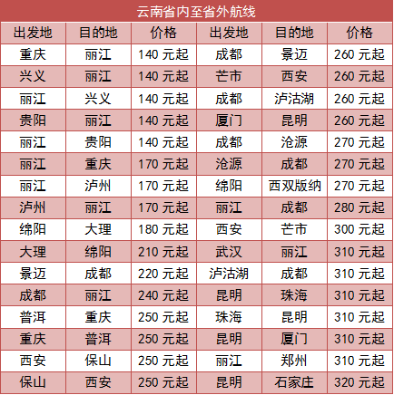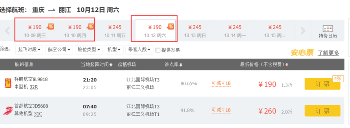 重庆飞丽江,190元,是未来两个月最便宜的价格。