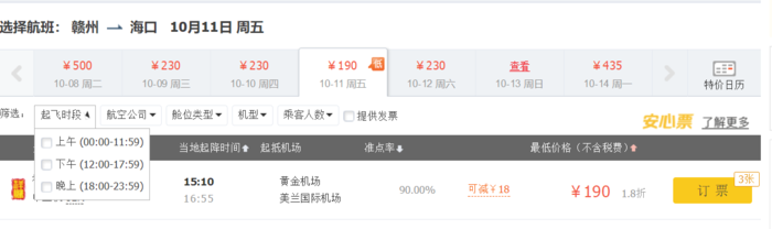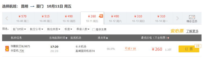 昆明飞厦门,260元,航班时间也不错,很便宜。