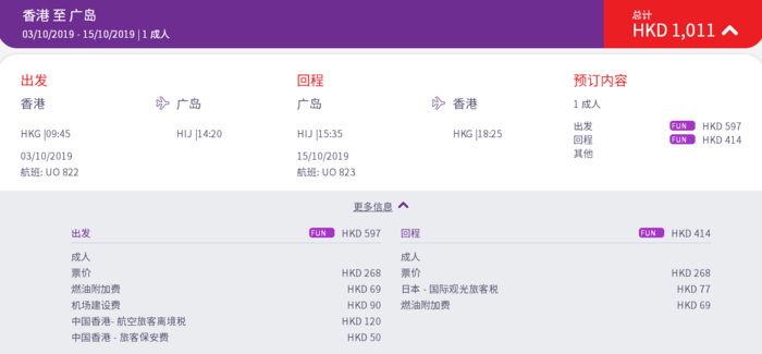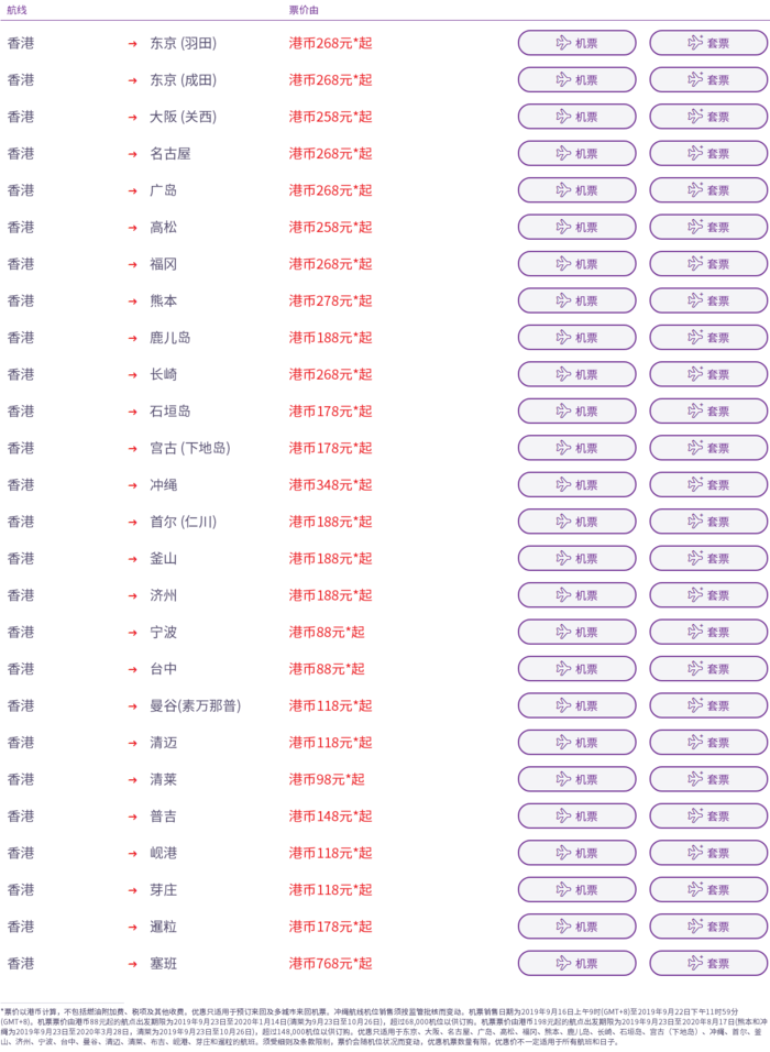 本次优惠航线与上一期一致,部分航线价格下调30—10港币。往返价格更加划算,购买单程机票价格上没有优势。