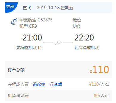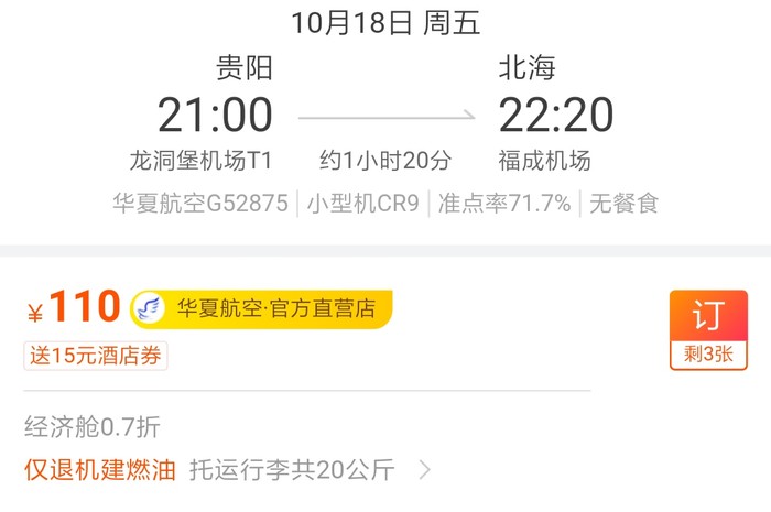 贵阳飞北海含税110元,飞猪上同样可以买到促销价格。