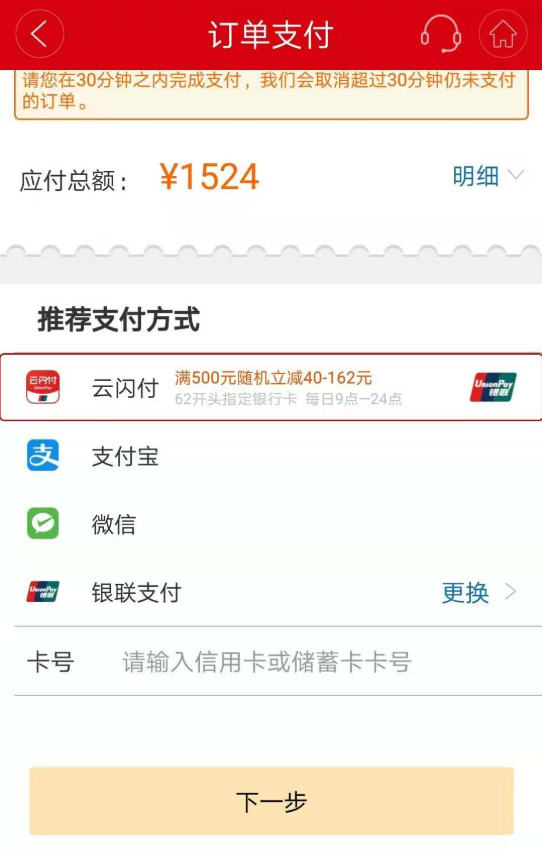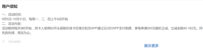 活动期间每天9时开始,持卡人使用62开头银联标准卡在南航APP购票,通过云闪付APP支付,享每单满500元随机立减,立减金额40-162元。持续到10.31