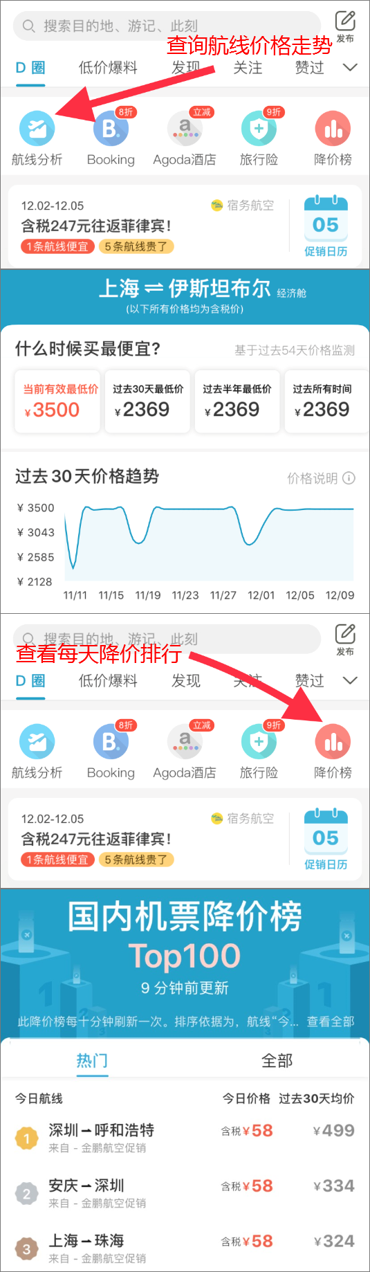 D圈不仅有特价机票,还上线了重磅功能:航线分析:购票前,可先来查查机票价格趋势,以免买贵~
