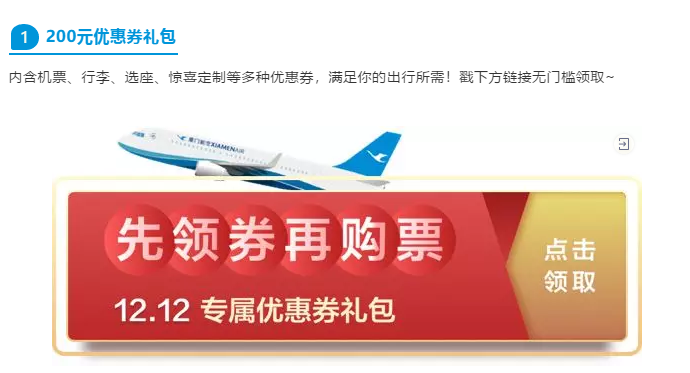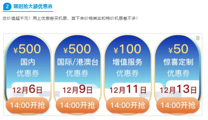 12.6~12.13,特定时间可抢机票优惠券、增值服务优惠券。