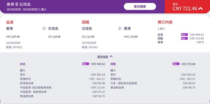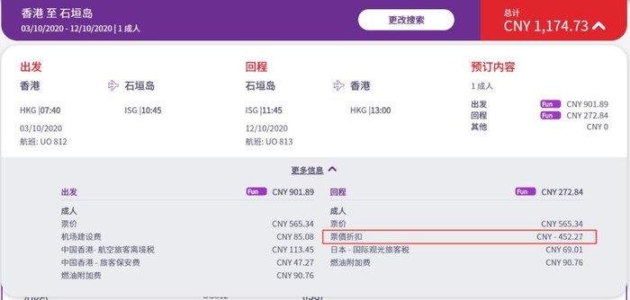 香港往返石垣岛,国庆+请假3天(10.3-10.12),含税约1174元,回程有2折优惠。