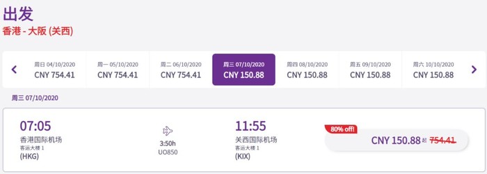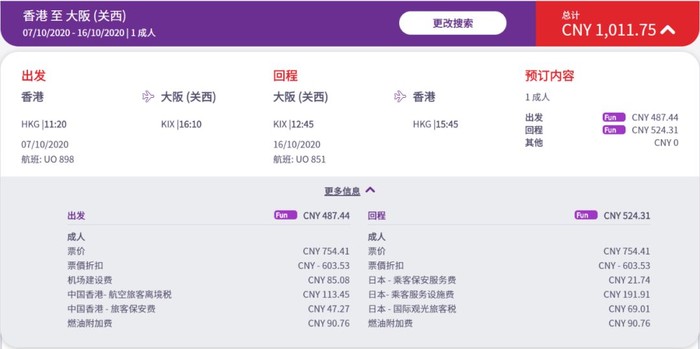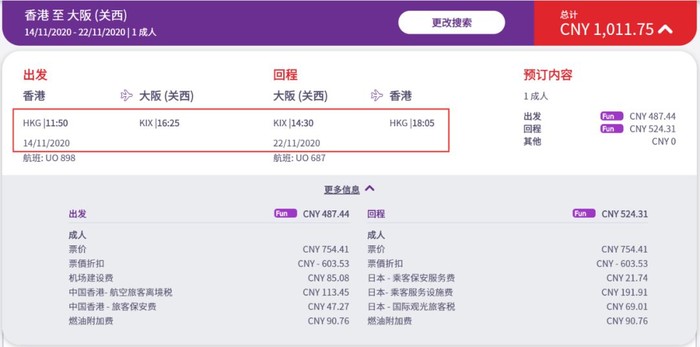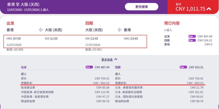 暑假,香港往返大阪,同样有优惠,含税1011元。
