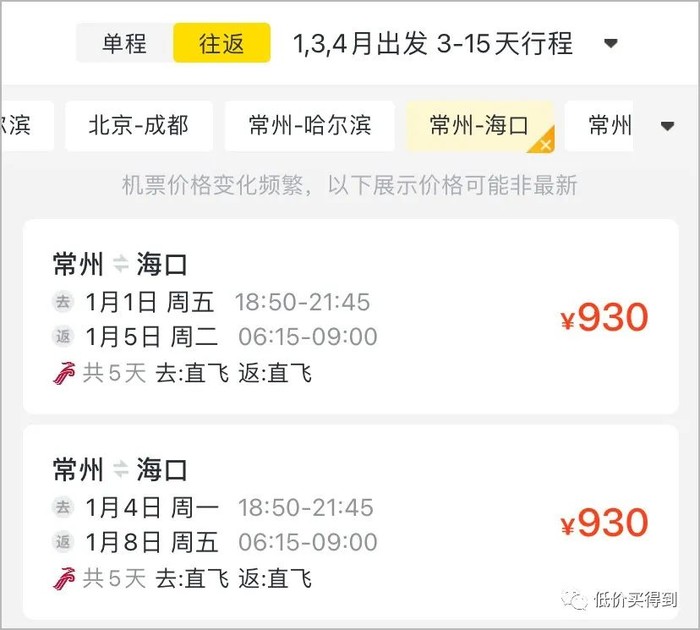 常州往返海口,未来一段时间出行,直接购票含税至少1030元。