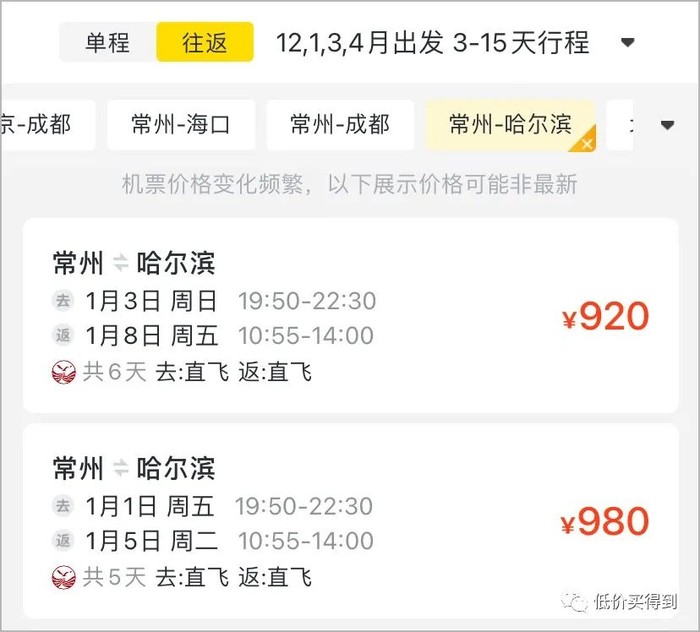 1月份常州往返哈尔滨,直接购票含税至少1020元。